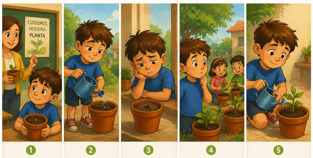 Al observar a sus compañeros, notó que sus plantas habían crecido verdes y fuertes porque las cuidaron con paciencia todos los días. Entonces comprendió que algunas cosas importantes no ocurren de inmediato, sino que necesitan tiempo, dedicación y constancia. Desde ese día, comenzó a hacer sus tareas con más atención, entendiendo que lo valioso no siempre es lo rápido, sino lo bien hecho.